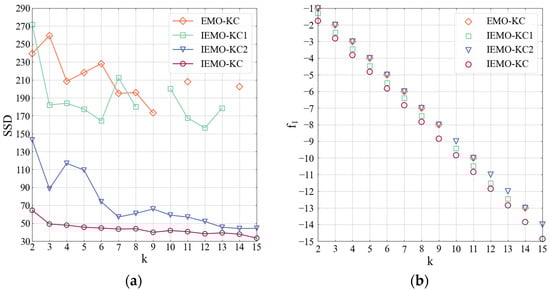 Table 4 shows the SSD and f1 obtained by the four algorithms on the five datasets under their actual number of clusters. It shows that the SSD of EMO-KC is the largest, and the f1 of EMO-KC is approximately equal to −2.00, which shows the poor validity of EMO-KC. However, the SSD and f1 of IEMO-KC1 are smaller than those of EMO-KC, which suggests that the scaling factor can help effectively optimize the objective of SSDexp. It can also be observed that the SSD of IEMO-KC2 is smaller than those of EMO-KC and IEMO-KC1. This is because in the valid initialization of IEMO-KC2, data points rather than points in the search space are selected as the cluster centroids, which allows the cluster centroids to be closer to the other data points, resulting in a smaller SSD. However, the f1 of IEMO-KC2 is approximately equal to −2.00 due to the lack of the scaling factor, indicating that the objective of SSDexp has not been effectively optimized. However, it is evident that IEMO-KC is able to obtain the smallest SSD and f1 simultaneously, which shows that the combination of the scaling factor and valid initialization in IEMO-KC contributes to the validity.