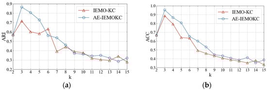 Table 5 shows the ARI and ACC of IEMO-KC and AE-IEMOKC on the five datasets under their actual number of clusters. It can be observed that AE-IEMOKC is able to obtain higher ARI and ACC, especially on the Optdigits dataset. This directly demonstrates that the autoencoder can improve the clustering accuracy due to its ability to obtain the feature representation of the dataset suitable for clustering and its ability to reduce the dimensionality of the dataset. In fact, this improvement is not limited to the solution with the actual number of clusters. Taking the Iris dataset as an example, Figure 5 shows the ARI and ACC of the Pareto fronts obtained by IEMO-KC and AE-IEMOKC. It can be observed that the improvement in the accuracy of the autoencoder also works for some other solutions. However, it does not work for all the solutions, as the clustering loss in Equation (4) is obtained under the actual number of clusters. Overall, the autoencoder has a significant positive effect on the solutions, which have numbers of clusters close to the actual number of clusters.