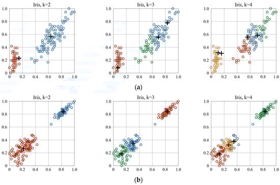 The clustering results obtained by IEMO-KC and AE-IEMOKC on the Iris dataset: (a) The clustering results obtained by IEMO-KC. (b) The clustering results obtained by AE-IEMOKC.