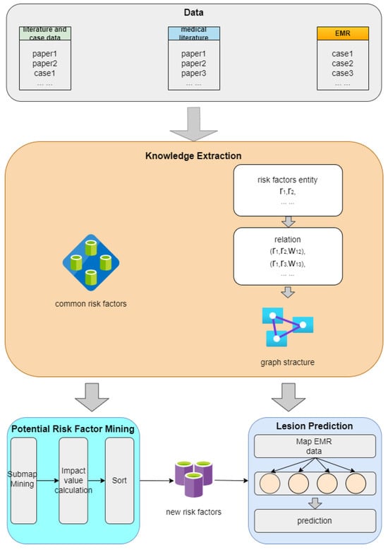 EMR data are often difficult to obtain, with small numbers and many missing values, making it more difficult to predict lesions. Therefore, we must take steps to uncover the key risk factors for disease. In this paper, we constructed the ontology knowledge base of cervical lesions containing risk factors that lead to the occurrence of cervical lesions and the relationships of risk factors by graph structure. Then, we proposed the key risk factor combination mining algorithm, which mines new key risk factors based on common risk factors through a subgraph mining method. In addition, we predicted patient lesions based on the set of key risk factors. The experiments showed that the new key risk factors improved the accuracy of prediction of cervical lesion. The overall design of the lesion prediction method is shown in Figure 1, the details of the knowledge graph construction are shown in the Figure 2.
