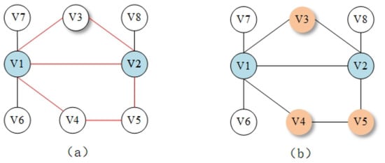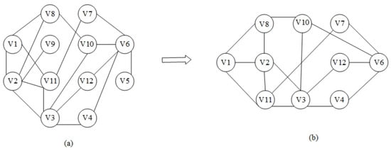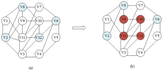 Figure 4a represents the risk factor relationship network structure, v1–v12 are keyword nodes, this algorithm combines common key risk factors two by two, takes any one risk factor in the combination as the starting point and depth-first search, finds another node within the minimum consumption and forms a subgraph Figure 4b with all nodes and edges on the path, and then performs further impact value analysis and calculation on all nodes in the subgraph to get the new key risk factor.