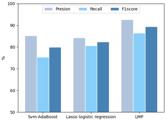 In this paper, we take the 5-fold cross-validation method to train the data and select lasso logistic regression [35] and Svm-AdaBoost [36] as comparison experiments, The precision, recall, and F1score comparisons of the three algorithms are shown in Figure 12 and Table 10, where the overall performance of our algorithm is better.