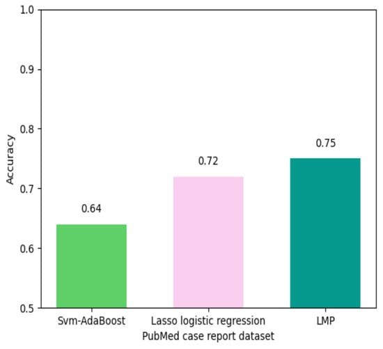 The above three datasets were validated and compared separately using 5-fold cross-validation for further validate the effectiveness of the algorithm in this study, the accuracy of each 5-fold was averaged for this algorithm accuracy. As shown in Figure 18, the accuracy of our proposed LMP algorithm was significantly higher than the other two comparison algorithms for the case report dataset collected on the PubMed website. The highest is about ten percent higher.