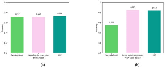 As shown in Figure 19a, the accuracy on the electronic medical record dataset collected from a hospital is close, and the LMP algorithm is about one percent higher than the other two algorithms. As shown in Figure 19b, and the LMP algorithm is close to the LASSO logistic regression algorithm accuracy on the TCGA-CESC dataset, which is much higher than the SVM-AdaBoost algorithm. These can prove that the accuracy of our proposed LMP algorithm can achieve good results on different datasets.