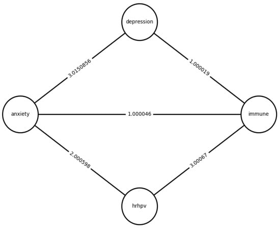In the structure of the risk factor relationship diagram, for anxiety, depression, and immunity are all correlated with high-risk HPV infection, but in fact, the role of the relationship among them is that anxiety leads to depression, and these emotional factors of anxiety and depression affect the function of a person’s immune system, which in turn leads to a decrease in immunity and leads to high-risk HPV infection.