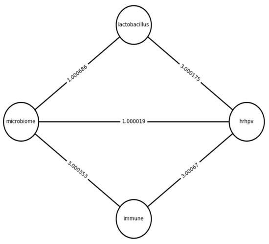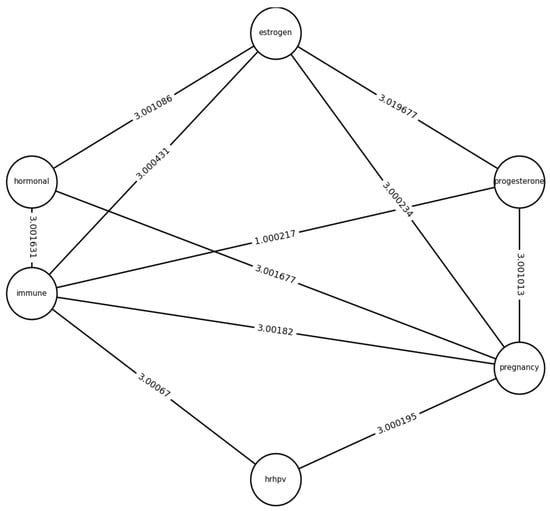 As shown in Figure 23, in the structure of the risk factor relationship diagram, hormones, estrogen, progesterone, pregnancy, and immunity are all correlated with high-risk HPV infection, but in fact, the relationship between them is that estrogen is a type of hormone, and estrogen and progesterone are mutually regulated, and during pregnancy, there are dramatic and obvious changes in various hormones that can disrupt the immune system and weaken resistance, which can lead to high-risk HPV infection. This is the reason why many pregnant women are susceptible to HPV infection. The values of their relationship in our graph structure also indicate this close relationship. Jing Liu.et al Using statistical analysis method, we found that most of the cervical lesions during pregnancy were accompanied by high-risk HPV infection [37]. Our method, however, not only found that high-risk HPV infection and cervical lesions were associated with pregnancy, but also found the causative factors behind them, i.e., changes in hormone levels as well as changes in immunity.