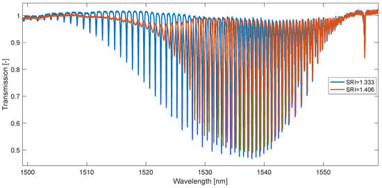 Before exceeding the leakage limit, individual modes only shift towards longer wavelengths under the influence of the increased SRI value. The mode presented in Figure 2 (1520.6 nm) for the 1.3994 refractive index value decreases its intensity compared to lower SRI values. This means that it is nearing the leakage limit. This is, therefore, the wavelength range with the greatest sensitivity to mode shift as a function of SRI.