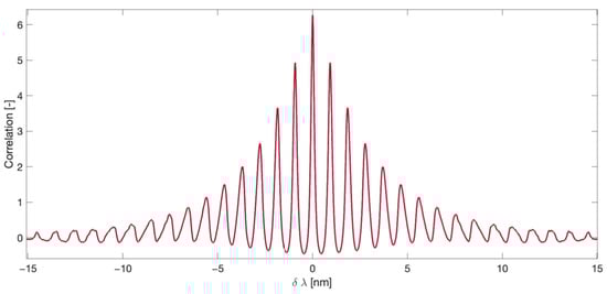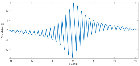 Figure 3 shows the autocorrelation function of a part of the spectrum A(λ) in the 1510–1524 nm range. This part of the optical spectrum has 4000 points. The spectrum can be moved relative to itself by this number of points, which creates the shape shown in Figure 3. As can be seen, the correlation has the highest value with a zero shift, and its envelope decreases with increasing shifts. The individual cladding modes create an almost periodic signal, which is reflected in the shape of the autocorrelation function. Autocorrelation has repeating lobes (peaks), which are the result of the repeatability of the shapes of cladding modes. The decrease in the amplitude of subsequent autocorrelation side lobes (peaks) results from the decrease in the common area of the product of both functions when calculating it for larger shifts δλ.