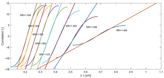 Various methods can be used to determine the position of the main lobe of individual cross-correlation functions. The simplest method is to determine the wavelength for maximum intensity. However, this is a low-resolution method limited by the spectral resolution of the measurement. To improve this resolution, the centroid method can be used to determine the maximum. The shift of the main lobe of the cross-correlation function calculated in this way depending on the SRI value is presented in Figure 5.