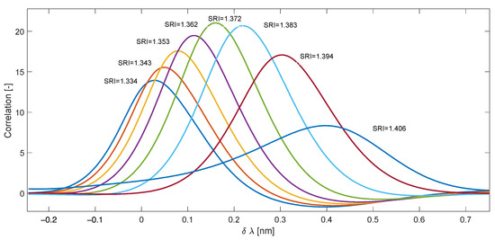 The cross-correlation method has many applications for signals analysed in the time domain. It is useful in cases where the measurement resolution is high and when the determined shift is much larger than the length of the analysed signal shape. Detecting the maximum of such a correlation function is possible, in principle, with accurate resolution of the signal measurement. Some increase in accuracy can be achieved by interpolating the correlation function at additional points. In the case of the analysis of optical spectra, the limitation is the spectral resolution of the optical measurement. If S1(λ) is the spectrum measured in reference conditions, then in the event of the influence of a specific physical quantity, the spectrum will be shifted by the value Δλ:
