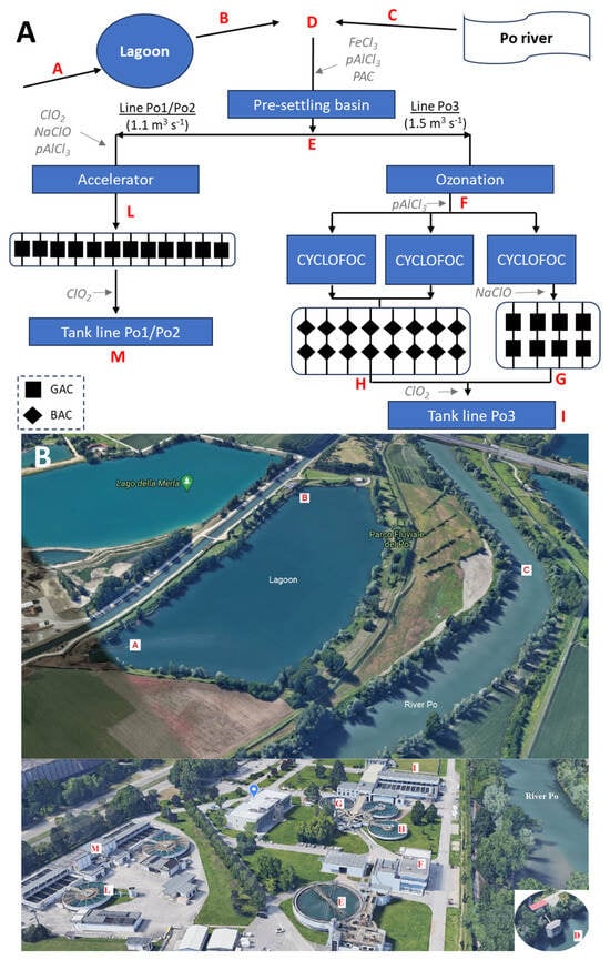 The studied DWTP treats a mix of water from the river Po (site C) and a lagoon located about 10 km upstream (sites A and B, for the lagoon’s inlet and outlet, respectively). The lagooning pre-treatment was included in the studied DWTP to improve the characteristics of treated water and reduce the amounts of chemical reagents needed along with the different processes. Water from sites B and C is mixed and passed through a wire mesh filter (6 mm2 mesh size), which removes most of the coarse contaminants and sediments (site D) before flowing into the treatment plant. The river bed is pumped (ca. 3.6 m3 s−1 flow) through 100 cm diameter steel pipelines into a static horizontal flow pre-settling basin (designed to handle a flow of 2 m3 s−1), which consists of a circular pool of 33 m in diameter and 5.15 m high (4300 m3 capacity and effective surface area of 850 m2) and equipped with a rotary dredge for the mechanical removal of sludge, where additives (iron or aluminium chloride salts) are used to promote the sedimentation process. Powdered activated carbon (PAC) is also added to remove emerging contaminants in this step. The sludge, accumulated at the bottom, is evacuated by two electric pumps with a capacity of 35 L s−1. At the outlet of the pre-settling basin (site E), the treatment plant is divided into three different lines, Po1 and Po2 (identical treatment lines hereafter named as Po1/Po2, with a total output of 1.1 m3 s−1) and Po3 (with an output of 1.5 m3 s−1).