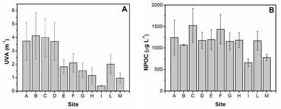 Obtained values in each sampling point for: (A) UVA; (B) NPOC. Values represent the average of consecutive measurements and error bars the associated uncertainty.