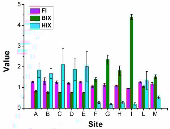 The FI was calculated as the ratio between the emission intensity at 450 nm with that at 500 nm when employing an excitation wavelength of 370 nm []. The BIX was calculated as the ratio between fluorescence intensities from the emission spectrum at 380 and 430 nm, respectively, excited at 310 nm []. Finally, the HIX was calculated as the ratio of the 435–480 nm emission spectrum with the analogous one of 300–345 nm (excitation wavelength 254 nm) [].