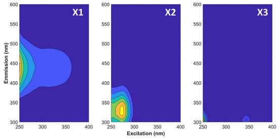The three components’ fingerprints can be found in Figure 4. According to their excitation and emission maxima, the PARAFAC components can be characterised as follows: deconvoluted component number 1 (X1), with a maximum < 250 nm excitation axis and ca. 440 nm emission axis that could be associated with either terrestrial humic or humic acid-like substances (HA-L). X2 with its maximum at 270/330 nm excitation/emission coordenates could be assigned to tryptophan-like substances (Try-L). Finally, X3, with its maximum at <250/300 nm, can most likely be associated with tyrosine-like substances (Tyr-L) [,]. In this sense, X2 could be considered the most relevant component regarding quality assurance monitoring, as it is reported that Try-L are potential indicators of Escherichia coli presence, whereas algal organic matter is associated with X1 [,].