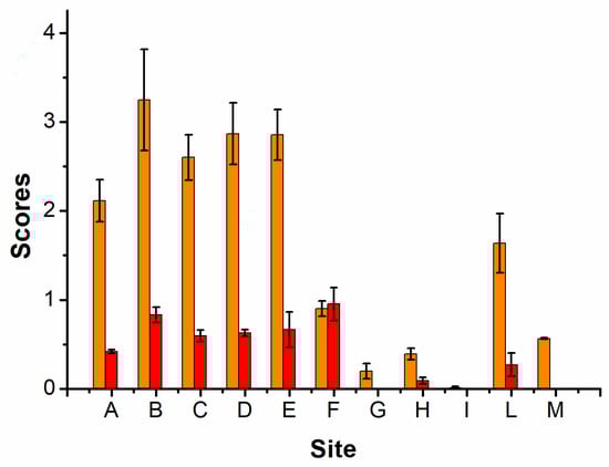As shown in Figure 5, when analysing the score values from each modelled component, the HA-L (X1) and Try-L (X2) have significant fluorescence signals along with the whole dataset, whereas Tyr-L (X3) score values were negligible in all cases, only detected at the outlet of both treatment lines (sites I and M). It is important to highlight that score values cannot be related directly to the abundance of each chromophore, as the fluorescence emission is not only dependent on the concentration but also on its quantum yield, which is characteristic of each chromophore.