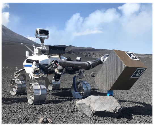 In the framework of the Helmholtz Future Project ARCHES (“Autonomous Robotic Networks to Help Modern Societies”), a heterogeneous team of robots was prepared to cooperate and autonomously deploy tools and sensors for the exploration of an unknown terrain [19,27,28,29,30]. In addition to performing scientific measurements, the mission scenario also includes the collection of samples. The space analogue demonstration mission at the foothills of Mount Etna in Sicily, Italy, chosen as a site similar to barren extraterrestrial surfaces such as the Moon, was originally scheduled for summer 2020 but was postponed twice due to the COVID-19 pandemic and finally took place in summer 2022.