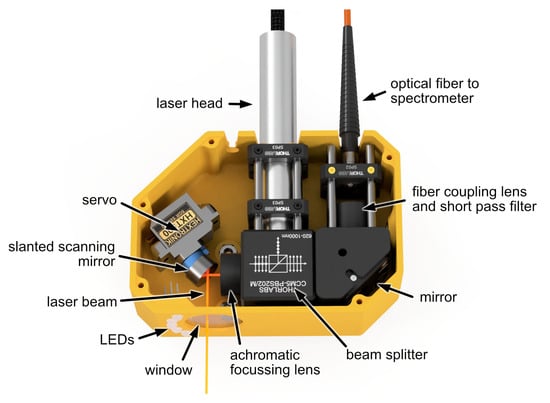 The laser-induced plasma’s emission is directed back into the instrument using the same mirror and achromatic lens. After passing through the beam splitter, it is coupled into an optical fiber connected to the spectrometer. The fiber coupling lens is an achromatic doublet with a focal length of 19 mm, ensuring full utilization of the numerical aperture of 0.22 of the optical fiber. To protect the spectrometer from intense directly back-scattered laser light, a short-pass filter with a cut-off wavelength of 950 nm is added in front of the fiber coupling lens. This filter has a specified optical density of about 5 at the laser wavelength, providing more than 97% transmission in the 500–940 nm pass band. All optical components are securely mounted in a 16 mm ThorLabs steel cage system, which imparts stiffness and long-term stability for the alignment of the optics. The housing of the measurement head is 3D printed from PETG using Fused Deposition Modeling (FDM) technology, providing a lightweight and cost-effective mechanical protection.