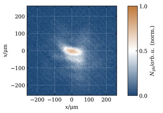 Figure 3 displays the ARCHES LIBS measurement head encompassing all optical components of the LIBS system. The laser beam is emitted from the laser head, deflected by a beam splitter, and focused with an achromatic lens. After a final reflection from a wobble mirror, the laser exits the measurement head through a glass window and strikes the target at approximately a 7 cm working distance. All optical components are off-the-shelf parts from ThorLabs with a 1/2 inch aperture and anti-reflection coatings. The beam splitter is of the polarizing type, providing around 95% overall reflectivity for the linearly polarized laser beam and between about 45% and 48% transmittance for the collected plasma emission. The achromatic lens is a doublet designed for the visible wavelength region with a focal length of 100 mm. The wobble mechanism is realized by a slanted mount of a flat mirror directly on the shaft of a servo motor, with a slanting angle of 8 degrees between the surface normal of the mirror and the rotation axis. This results in a cost-effective and compact scanning unit that allows sampling along a 3 cm long arc on the target. The reflective coating of the mirror is enhanced silver, providing a good reflectivity of about 96% over the relevant wavelength region of 500 nm to 1064 nm. Furthermore, the mirror is able to withstand the laser beam’s peak energy density, which we estimate to be on the order of 1 J/cm2, resulting from the laser beam’s second-moment width of about mm. The laser spot on the sample has a roughly elliptical shape with a Full Width at Half Maximum () of about 90 m along the major axis and about 40 m along the minor axis as seen in Figure 4. It should be noted that the is generally not an ideal measurement unit for multi-mode lasers. However, we chose to use this unit since it is more robust against noise and a reasonable estimate for the size of the laser beam on the target for the purpose of LIBS.