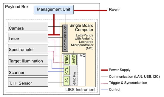 All hardware components are under the control of a LattePanda single-board computer (SBC). The SBC also interfaces with a temperature and humidity sensor (DHT11), providing information about the environment inside the payload box during rover operations. Electrical power is supplied through the docking interface between the rover’s robotic arm and the payload box. A power distribution unit (PDU), integrated into the standardized payload box system, distributes electrical power to all instrument components (refer to Figure 1). The payload box infrastructure facilitates communication between the instrument and the rover. Alongside the PDU, this combination forms the Management Unit of the payload box system as illustrated in Figure 5.