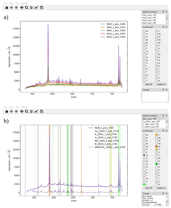 Screenshots of the application used to visualize and analyze the recorded LIBS data. In panel (a), the shot averages per position of a LIBS measurement are shown just after loading the data. Panel (b) shows the GUI after using the automatic line identification feature. For a better overview, the titanium (Ti) lines are hidden.