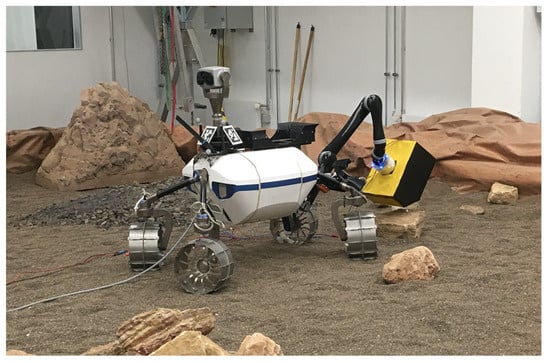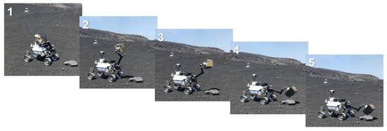 The LRU2 is one of two similar rovers developed at DLR, participating in the space analogue demonstration mission of the ARCHES project [18,19,27,28]. Weighing less than 30 kg, the rovers are powered by rechargeable batteries providing 200 Wh and can achieve speeds of over 7 km/h. Both LRU1 and LRU2 feature a pan–tilt camera head for navigation. In addition, LRU1 is equipped with multi-spectral and high-resolution cameras for scientific imaging, and LRU2 features a robotic arm with a docking interface to which standardized payload modules can be coupled. With its robotic arm, the LRU2 can deploy small tools, such as a hand for grasping [31], a WLAN repeater, or a box into which collected samples can be placed. The arm also enables the LRU2 to position engineering or scientific payloads in the field. In the mission scenario, various modules are fetched by the rover from the main spacecraft, the landing system. After picking up the desired payload box using its robotic arm, the LRU2 places the box in a transportation frame on its back to secure the payload for driving to the location where the module is needed. Upon arrival, the LRU2 can pick up the box from its transportation frame and utilize the payload’s features at the location of interest.