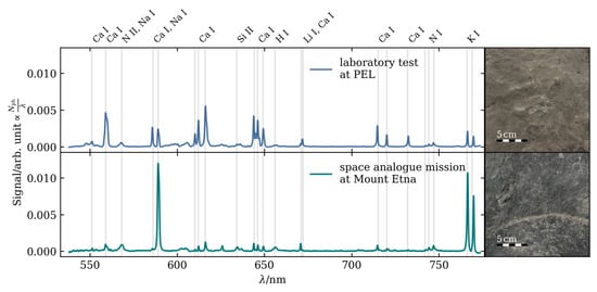 The acquired LIBS data enable both qualitative and quantitative elemental analysis of the investigated sample. In the wavelength range of the ARCHES LIBS instrument from 531 to 776 nm, several major and minor rock-forming elements are available. Figure 10 displays two LIBS spectra acquired with the ARCHES LIBS: one from an unknown rock at the testbed at PEL and the other from a presumably igneous rock with a volcanic context at the foothills of Mt. Etna during the demonstration mission. Each spectrum represents the average of ten laser shots from a single position on the sampled rock.