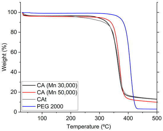 Regarding the thermal proprieties of the CA and the PEG, Figure 1 and Figure 2 show the TGA and the DSC characterization of the virgin materials under study, respectively. Regarding TGA, studies were carried out on the loss of mass of the virgin materials in relation to the increase in temperature, where the main mass loss phase for PEG2000 starts at ≈350 °C and ends at ≈430 °C. For commercial CA and CAt, the main mass loss phase starts at ≈315 °C and ends at ≈350 °C.