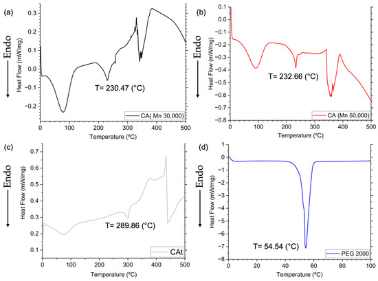 DSC of virgin materials: (a) CA (Mn 30,000); (b) CA (Mn 50,000); (c) recycled CAt; (d) PEG2000.