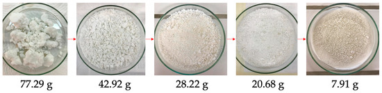 As a sheath that is more environmentally friendly for PCFs, CAt (recycled cellulose acetate from textile waste) was produced using the homogeneous acetylation method [37]. In detail, 2.0 g of cotton fabric was first cut into thin strips and left in the desiccator for 24 h. The process was started by adding 40 mL of CH3COOH to 2.0 g of the cotton fabric. This mixture was stirred for 30 min at room temperature. Subsequently, a solution of H2SO4 and CH3COOH (0.3 mL and 17.5 mL, respectively) was added and the mixture was stirred for 15 min at room temperature. After 15 min, the textile was filtered and separated from the solution. At this point, 20 mL of (CH3CO)2O was added to the liquid, the textile was replaced and the solution stirred at room temperature for 24 h. After 24 h, the solution was removed from the stirrer and slowly added to a beaker containing 1.0 L of dH2O. Finally, the CAt was vacuum-filtered (Diaphragm Vacuum Pump N810, LABOPORT, Ebhausen, Germany) and washed with dH2O until pH 7 was reached. The CAt was dried in a drying and sterilyzing oven (J.P Selecta, Barcelona, Spain) overnight at 50 °C and stored in a humidity-controlled environment for further characterization. The drying stages of the recycled CAt are shown in Figure 3.