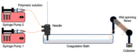For all productions, the wet spinning setup consisted of a syringe pump NE-1000 (New Era Pump Systems Inc., Farmingdale, NY 11735, EUA), a coagulation bath of dH2O at room temperature, a collector, and a needle (uniaxial or coaxial and one/two syringes connected to the pump, with the latter two parameters adjusted according to the type of fibre produced). A representative schematic of the wet spinning process is shown in Figure 4. The fibre collector consisted of aluminium foil wrapped around an automatic collector at a moderate velocity of 6.21 rpm. The distance between the collector and the needle was 45 cm, and the distance between the needle and the coagulation bath was 5 cm.