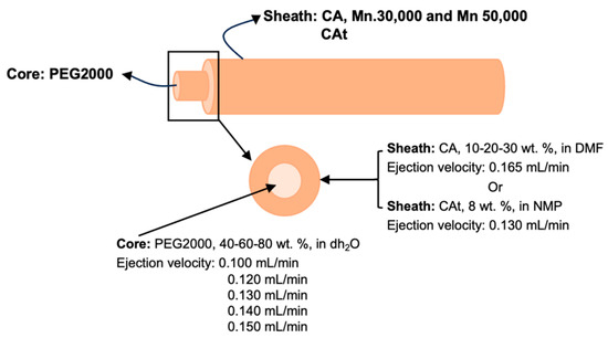 The parameters of the wet spinning process were adjusted to obtain fibres with better properties [39] and are demonstrated in Figure 5. The ejection velocity for CA was 0.165 mL/min, while for PEG2000, it varied from 0.130 to 0.140–0.150 mL/min. Fibres with CAt and PEG2000 were produced with slightly lower ejection velocities, namely 0.130 mL/min for CAt and (0.100–0.120 mL/min) for PEG2000. In the case of coaxial fibres, CAt required different ejection velocities to obtain enough time to compose a coaxial system with a protective sheath.