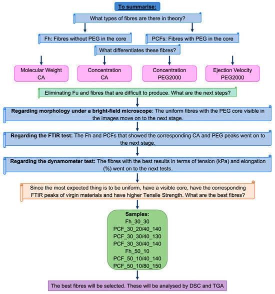 Before starting to analyse the results, a flowchart was drawn up (Figure 6) showing production with CA in the sheath and PEG2000 in the core. This flowchart considered the number of samples produced and their variables. This approach aimed to better organise and justify the choice of the best conditions for carrying out both the production of the samples with recycled CA and more detailed tests, such as dynamometry, DSC, and TGA, which were planned for this article.
