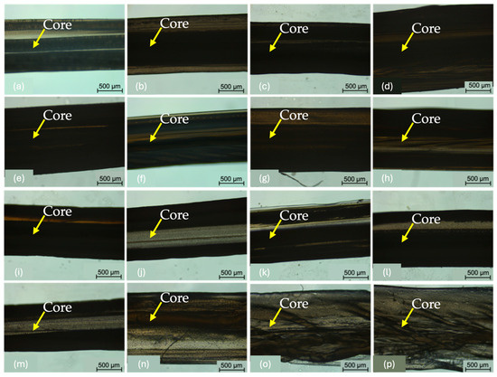Micrographs of the morphology of the hollow and PEG2000-incorporated fibres obtained by brightfield microscopy. (a) Fh_30_30; (b) PCF_30_10/60_150; (c) PCF_30_10/80_150; (d) PCF_30_20/40_140; (e) PCF_30_30/40_130; (f) PCF_30_30/40_140; (g) PCF_30_30/40_150; (h) PCF_30_30/80_150; (i) Fh_50_10; (j) PCF_50_10/40_130; (k) PCF_50_10/40_140; (l) PCF_50_10/80_140; (m) PCF_50_10/80_150; (n) Fht_8; (o) PCFt_8/40_100; (p) PCFt_8/80_120.