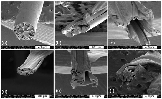 The different types of fibre structure were observed by SEM, as shown in Figure 9. In general, the structures have an expected shape, where Fu, being uniaxial, has a cylindrical structure. In comparison, Fh has a coaxial hole, albeit a small one, which could be affected by the fact that it was filled with dH2O; when it met the coagulation bath, as it did not have a core structure, the structure collapsed and flattened. The PCF composed of CA (Mn 30,000) in the sheath and PEG2000 in the core had a more cylindrical structure with a larger opening compared to the PCF composed of CA (Mn 50,000) in the sheath and PEG2000 in the core, which not only had a smaller coaxial structure but also had a flattened structure. In addition, the PCFt with a PEG2000 with an 80% concentration in the core showed a similar (albeit less uniform) structure to the PCF_50, with the same PEG2000 concentration.