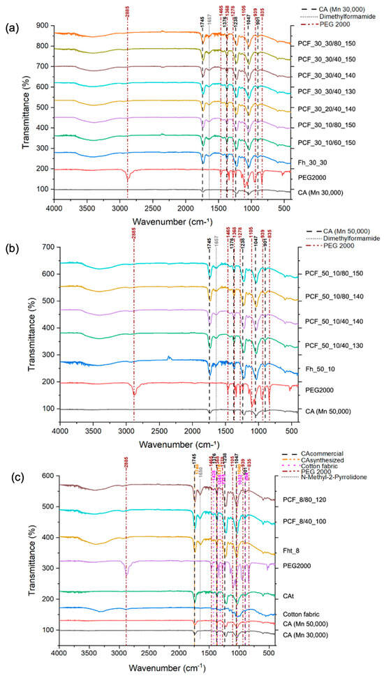 The different (functionalized) fibre samples were designated by an alphanumeric string, as shown in Table 2, called Fu_a_b, Fh_a_b and PCF_a_b/x_y for the fibres with CA/PEG2000 and Fut_b, Fht_b and PCFt_b/x_y for the fibres with CAt/PEG2000. Fu, Fut, Fh, Fht, PCF, and PCFt indicate the type of fibre (uniaxial, recycled uniaxial, hollow, recycled hollow, phase change fibres, and recycled phase change fibres, respectively). Next, the letter a represents the molecular weight (Mn 30,000 or Mn 50,000) of the CA, the letter b represents the concentration of CA (10–20–30 wt. %) and CAt (8 wt. %), the letter x represents the concentration of PEG2000 (40–60–80 wt. %), and, finally, the letter y represents the ejection velocity of PEG2000 (0.100–0.120–0.130–0.140–0.150 mL/min). In this case, the concentration of the solvent DMF, the solvent NMP, the ejection velocity of CA (0.165 mL/min), the ejection velocity of CAt (0.130 mL/min), and the molecular weight of PEG (Mn 2000) were not represented in the alphanumeric string of the samples, as they are constant values. For example, in PCF_30_30/40_140, where the structure PCF_a_b/x_y, i.e., is represented, PCF is the designation for a phase change fibre; the letter a is 30, which is the molecular weight of the CA (Mn 30,000); the letter b is 30, meaning a 30% concentration of the CA solution; the letter x is 40, meaning a 40% concentration of the PEG2000 solution; and, finally, the letter y is 140, referring to the 0.140 mL/min ejection velocity of the PEG2000.