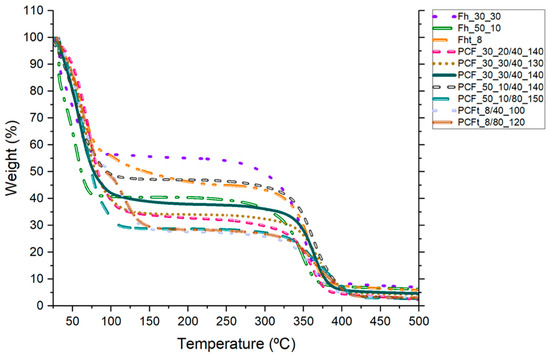 TGA curves of the Fh, PCF, Fht and PCFt fibres obtained from 25 to 500 °C under a nitrogen atmosphere, flow rate of 200 mL/min, and temperature rise of 10 °C/min.