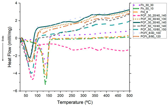 DSC curves of the Fh, PCF, Fht and PCFt fibres obtained from 25 to 500 °C under a nitrogen atmosphere, flow rate of 200 mL/min, and temperature rise of 10 °C/min.