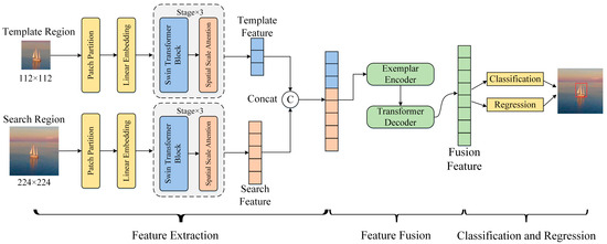 The overall network structure of the SSTrack is illustrated in Figure 2, comprising three main components: the feature extraction sub-network based on Swin Transformer, the feature fusion sub-network based on exemplar attention, and the classification and regression sub-network.