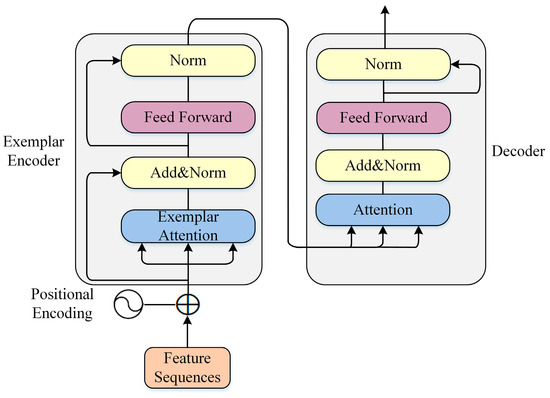 In the feature fusion sub-network, we adjust the utilization of position encoding by separating the traditional position encoding from the binding relationship with the feature sequence. This separation allows for a more comprehensive interaction of concatenated features during the feature fusion stage [34]. The exemplar attention module implements visual motion representation learning in the encoder–decoder structure. The encoder is responsible for the feature fusion of the concatenated features. At the same time, the decoder is utilized for visual motion representation learning, enhancing the understanding of the tracked target images. The overall structure is illustrated in Figure 4.