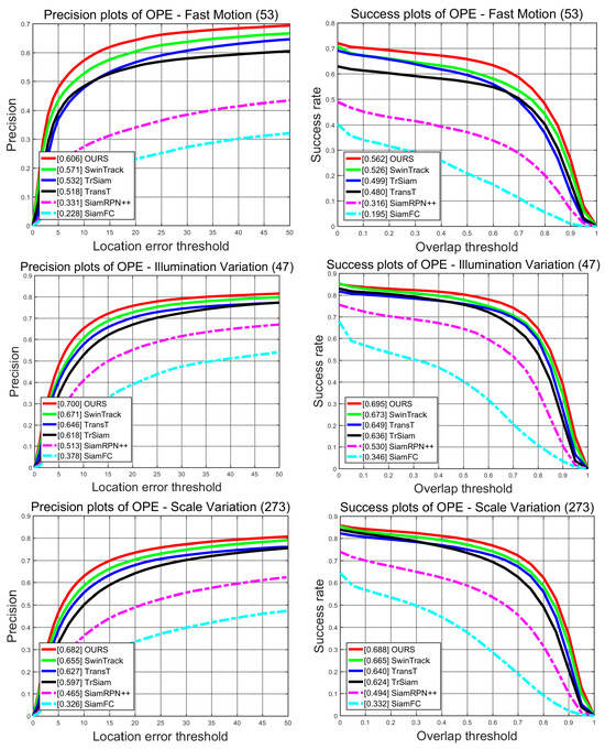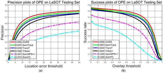 LaSOT [43] comprises 1400 video sequences, with a total frame count exceeding 3.5 million and an average sequence length of 2512 frames. Utilizing precision and success rate as evaluation metrics, LaSOT’s longer video sequences better reflect the algorithm’s robustness.