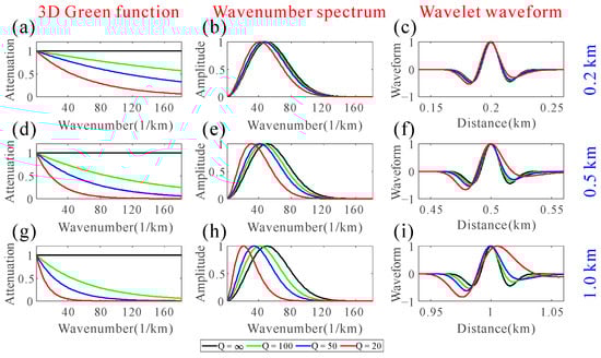 Source wavelet changes when propagating different distances with different Q values, including the 3D Green function for distance (a) 0.2 km, (d) 0.5 km, and (g) 1.0 km; the wavenumber spectrum for (b) 0.2 km, (e) 0.5 km, and (h) 1.0 km; the wavelet waveform for (c) 0.2 km, (f) 0.5 km, and (i) 1.0 km density, respectively.