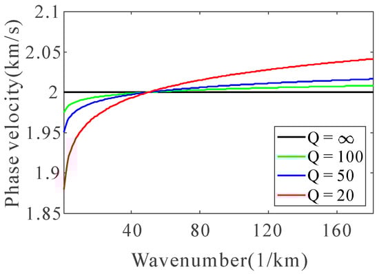 For a homogeneous viscoacoustic medium with a velocity of 2 km/s and a Q value of 20, the wavenumber-domain 3D Green function is shown as the red curve in Figure 1a, indicating that the higher the wavenumber, the greater the attenuation. When a depth-domain Ricker wavelet with a dominant wavenumber of 50 km−1 propagates 0.2 km in this medium, its wavenumber spectrum and depth-domain waveform are shown as the red curves in Figure 1b,c. As shown in Figure 1c, due to the attenuation, the wavelet is no longer symmetric, the waveform widens, and the amplitude of the right sidelobe decreases. The remaining black, green, and blue curves in Figure 1a–c, respectively, show the change in the depth-domain Ricker wavelet after it propagates 0.2 km in this medium with Q values of infinity (elastic), 100, and 50. It is evident that the waveform of the wavelet becomes wider and the right sidelobe becomes more attenuated with decreased Q values. Figure 1d–i show the changes of the depth-domain Ricker wavelet after it propagates 0.5 and 1.0 km in this medium with different Q values, respectively. It can be found that the larger the distance under the same Q value, the greater the distortion of the waveform. The red curve in Figure 1h gives the wavenumber spectrum of the source wavelet after a 1.0 km propagation in this medium with a Q value of 20. It can be seen that the peak wavenumber is about 28 km−1, indicating that the degree of attenuation media is about 45%. The corresponding waveform of the depth-domain wavelet is represented by the red curve in Figure 1i, where the right sidelobe is completely absorbed. Comparing the waveforms of the depth-domain wavelet in Figure 1c,f,i, it can be seen that the position of the peak is dislocated from that of the elastic due to the influence of wavenumber dispersion. The reference velocity corresponding to the reference wavenumber 50 km−1 is set as 2 km/s in this test, so the component lower than the reference wavenumber propagates at a slower velocity. Conversely, the component that is higher than the reference wavenumber propagates at a faster reference velocity. Figure 2 shows the specific phase velocity of this medium under different Q values.