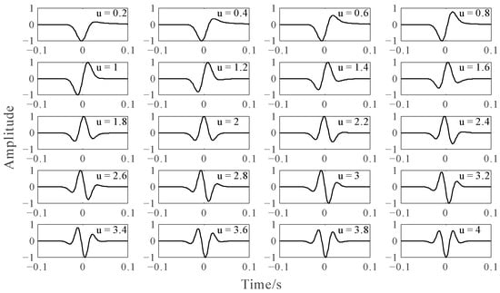 where u represents the fractional derivative, which controls the sidelobe and phase, denotes the reference frequency, controlling the width, and denotes the time delay, which controls the central position of the generalized seismic wavelet. Figure 3 shows the generalized seismic wavelet with different fractional derivatives. The reference frequency of these generalized seismic wavelets is 20 Hz, and the time delay is 0 s. It can be seen that the larger the fractional derivative, the greater the sidelobe, and the larger the phase rotation. When the fractional derivative equals 2, the generalized seismic wavelet is equivalent to the Ricker wavelet.