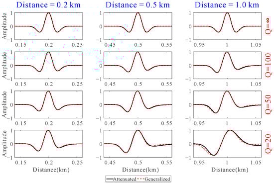 It is necessary to investigate the similarity between the depth-domain generalized seismic wavelet and the depth-domain attenuated wavelet before using the former to characterize the latter. Hereinafter, the term “attenuated wavelet” will refer to the wavelet of attenuation media. Figure 4 compares the depth-domain generalized seismic wavelets and attenuated wavelets shown in Figure 1, where the Q value differs between rows, and the distance varies between columns. The parameters of the depth-domain generalized seismic wavelet used in Figure 4 are shown in Table 1, where the reference wavenumbers correspond to the peak wavenumbers of the wavenumber spectrum of the depth-domain attenuated wavelets shown in Figure 1, and the fractional derivatives are obtained according to experience. Additionally, the depth delay equals the distance. As can be seen from Figure 4, the depth-domain generalized seismic wavelet and the depth-domain attenuated wavelet always have high similarity. Although the error of the two gradually increases with the decrease in the Q value or the increase in the propagation distance, the error is still tiny, even in the case of a 1.0 km propagation in the strong attenuation media with Q = 20.