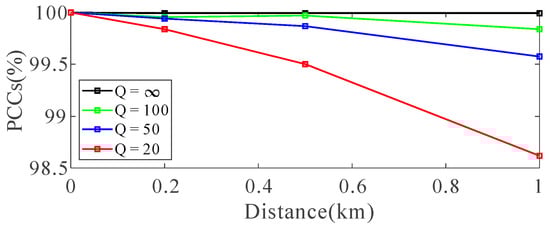 PCCs between the depth-domain generalized seismic wavelet and the depth-domain attenuated wavelet shown in Figure 4.
