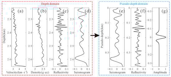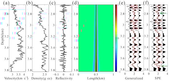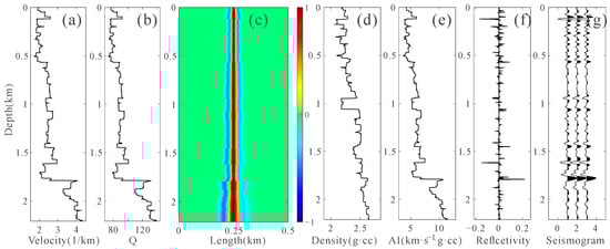 A depth-domain weak attenuation model with sampling number 885 and a depth sampling interval of 0.0025 km is presented in Figure 7, which is used to elaborate the workflow of our depth-domain generalized seismic wavelet extraction method. Figure 7a,b depict the velocity and Q, respectively. When a 20 Hz Ricker wavelet propagates through the weak attenuation model, the depth-domain attenuated wavelets computed by Equation (27) are displayed in Figure 7c. It can be seen that with increasing depth, the waveform of the attenuated wavelet is no longer symmetrical. The energy of the right sidelobe decreases, and the energy of the left sidelobe increases. Figure 7e is the AI calculated through the density shown in Figure 7d and the velocity shown in Figure 7a. Figure 7f is the reflection coefficient. Substituting the depth-domain attenuated wavelets and the reflectivity into Equation (20) yields the depth-domain synthetic seismogram, as demonstrated in Figure 7g.