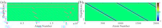 Next, the proposed method extracts the depth-domain generalized seismic wavelets from the depth-domain synthetic seismogram. Figure 8a shows the overcomplete dictionary established by the depth-domain generalized seismic wavelets during the first OMP-Gd. The search range of the fractional derivative is 1.5~2.1 with an interval of 0.05, the search range of the reference wavenumber is 6~26 km−1 with an interval of 1 km−1, and the depth delay ranges from 0 to 2.21 km with an interval of 0.0025 km. Figure 8b shows the first 2000 atoms enlarged in Figure 8a.