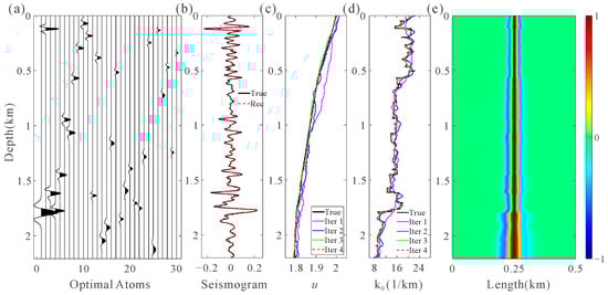 The depth-domain generalized seismic wavelet extraction test of Figure 7g is demonstrated in Figure 9. Figure 9a shows the first 30 optimal depth-domain generalized seismic wavelet atoms obtained from the first OMP-Gd. The red dotted line in Figure 9b represents the reconstructed seismogram of the first OMP-Gd obtained by adding these optimal atoms, and the black solid line is the actual seismogram. It can be seen that the primary waveforms of the reconstructed seismogram match those of the real seismogram well. Figure 9c,d show the extracted fractional derivative and reference wavenumber, respectively, where the solid black line represents the reference value calculated according to the analytical wavenumber spectrum of Equation (26). The magenta, blue, and green solid lines represent the extraction results of the first, second, and third iterations of OMP-Gd, while the red dotted line is the result of the fourth OMP-Gd (the final output). It can be seen that with the increase in the number of iterations, the extracted parameters of depth-domain generalized seismic wavelets move closer to the reference values. Figure 9e shows the corresponding depth-domain generalized seismic wavelets, which are very similar to the depth-domain attenuated wavelets in Figure 7c.