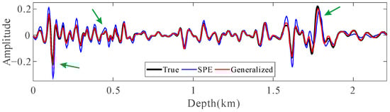 Comparison between the real seismogram (black) and those obtained by the pseudo-depth-domain SPE method (blue) and the proposed method (red). The waveforms of SPE method indicated by the green arrows exhibit more dislocation than those of the proposed method.