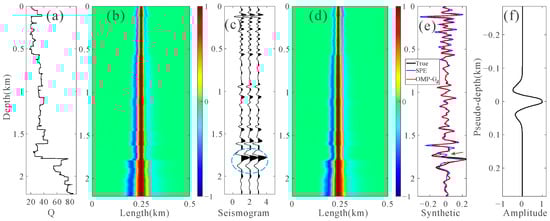 Test of the depth-domain strong attenuation model. (a) Q; (b) depth-domain attenuated wavelets; (c) depth-domain attenuated seismogram; (d) extracted depth-domain generalized seismic wavelets; (e) comparison between the real seismogram (black) and those obtained by the pseudo-depth-domain SPE method (blue) and the proposed method (red); (f) pseudo-depth-domain constant wavelet.